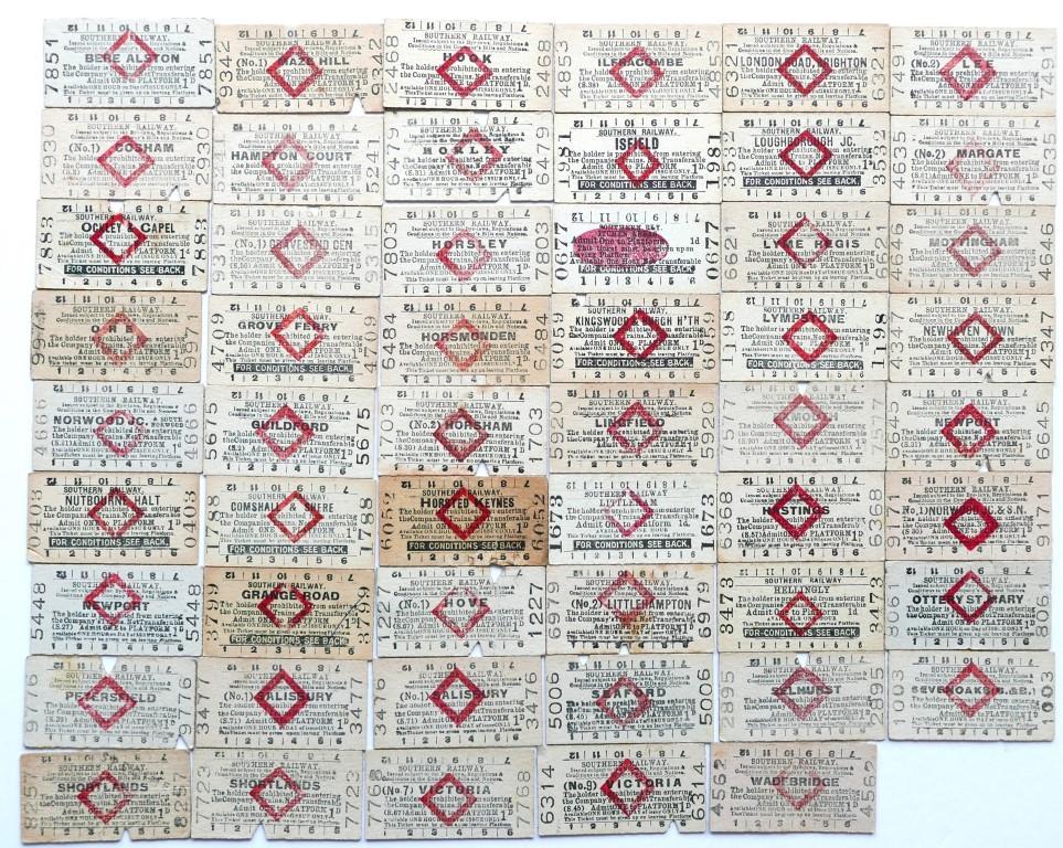 770 | Approx 52 SR red diamond Edmondson card platform tickets. Tape marks on the back of approx half. Occasional duplication. | £90 |  |